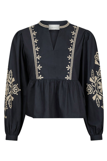 - Smuk skjortebluse fra Neo Noir med lange pufærmer, rund hals med v-udskæring og de flotteste broderet detaljer.