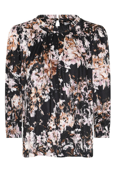 - In Front's skønne Grazia bluse med et flot print i fine farver. Blusen har ¾ lange ærmer og rund hals der lukkes i nakken med en lille knap.