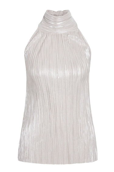 - Beautiful and shiny halterneck top in pleated fabric. Designed with a high collar, a tie knot at the neck, and a deep back cutout. RESPONSIBLE: 100% Polyester (Recycled)