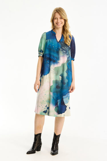 OBS! Fjernlager. Levering kan blive forlænget med 2-3 dage, hvis varen ikke findes i vores butik lige nu.Smuk kjole fra In Front med ½ lange let puffede ærmer, kinakrave med v-udskæring og det flotteste maleriske print.