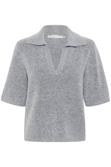 OBS! Fjernlager. Levering kan blive forlænget med 2-3 dage, hvis varen ikke findes i vores butik lige nu.Blød og lækker strik fra Gestuz med en blød krave og v-udskæring i halsen, kort ærmer og en afslappet silhuet.
