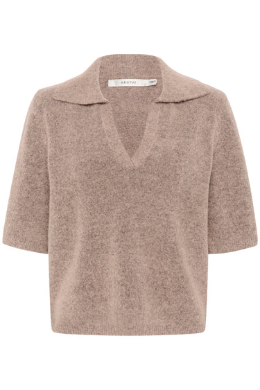 OBS! Fjernlager. Levering kan blive forlænget med 2-3 dage, hvis varen ikke findes i vores butik lige nu.Blød og lækker strik fra Gestuz med en blød krave og v-udskæring i halsen, kort ærmer og en afslappet silhuet.