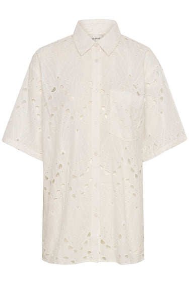 OBS! Fjernlager. Levering kan blive forlænget med 2-3 dage, hvis varen ikke findes i vores butik lige nu.Flot broderi anglaise skjorte fra Gestuz med korte ærmer, krave i halsen og knaplukning langs fronten.