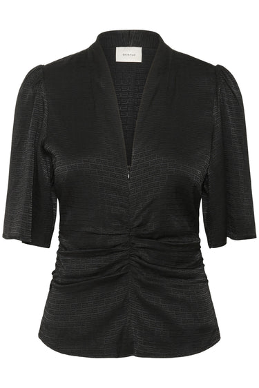 - OBS! Fjernlager. Levering kan blive forlænget med 2-3 dage, hvis varen ikke findes i vores butik lige nu.Smuk bluse fra Gestuz med korte ærmer, v-udskæring i halsen og flotte rynkeeffekter langs fronten.