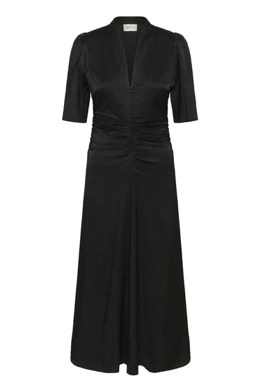 OBS! Fjernlager. Levering kan blive forlænget med 2-3 dage, hvis varen ikke findes i vores butik lige nu.Smuk kjole fra Gestuz med korte ærmer, v-udskæring i halsen og flotte rynkeeffekter langs fronten.