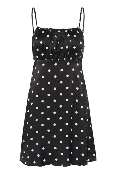 OBS! Fjernlager. Levering kan blive forlænget med 2-3 dage, hvis varen ikke findes i vores butik lige nu.Sød kjole fra Gestuz med smalle justerbare skulderstropper, et feminint snit og skønne prikker.