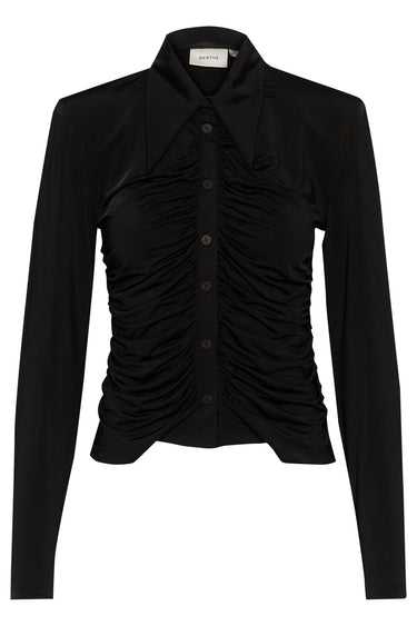 OBS! Fjernlager. Levering kan blive forlænget med 2-3 dage, hvis varen ikke findes i vores butik lige nu.Flot bluse fra Gestuz med lange ærmer, spids krave i halsen og smukke draperet effekter langs knappanelet foran.