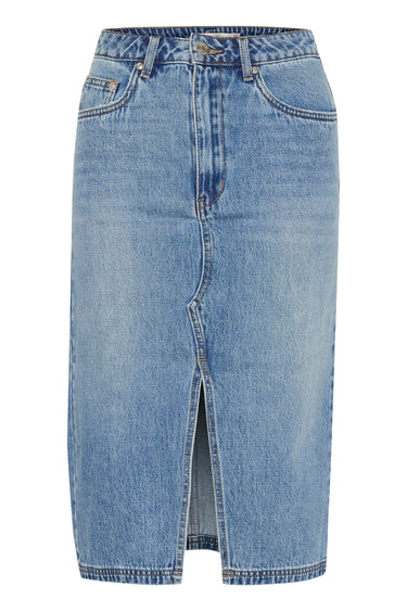 - OBS! Fjernlager. Levering kan blive forlænget med 2-3 dage, hvis varen ikke findes i vores butik lige nu.Klassisk denim nederdel fra Gestuz med høj talje og en fin slids i fronten.