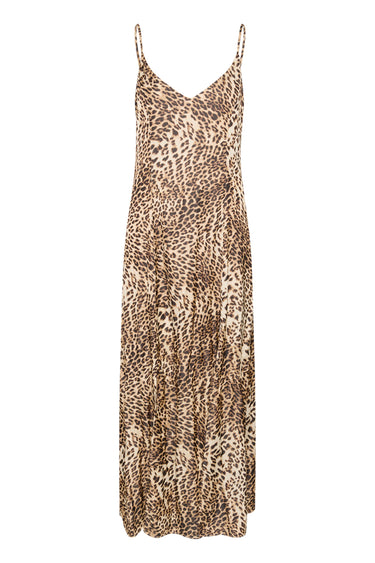 OBS! Fjernlager. Levering kan blive forlænget med 2-3 dage, hvis varen ikke findes i vores butik lige nu.Smuk kjole fra Gestuz med smalle justerbare skulderstropper, slids i siden og et skønt leopard print.