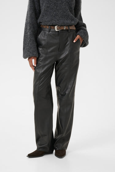 OBS! Fjernlager. Levering kan blive forlænget med 2-3 dage, hvis varen ikke findes i vores butik lige nu.Lækre skindbukser fra Gestuz med et straight-leg snit, mid-rise talje og et flot enkelt udtryk.