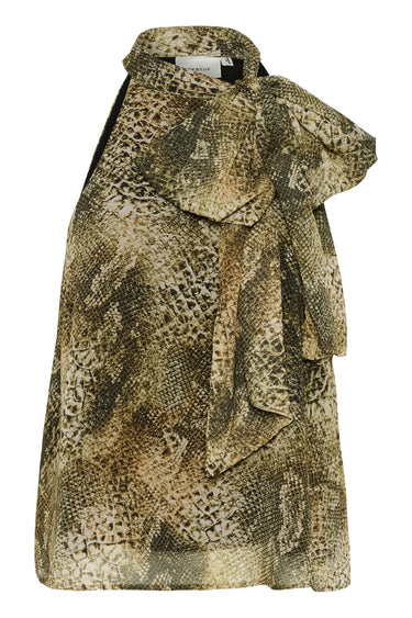OBS! Fjernlager. Levering kan blive forlænget med 2-3 dage, hvis varen ikke findes i vores butik lige nu.Elegant top fra Gestuz med et bred bindebånd i halsen og et skønt print.