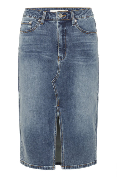 OBS! Fjernlager. Levering kan blive forlænget med 2-3 dage, hvis varen ikke findes i vores butik lige nu.Smart denim nederdel fra Gestuz med slids foran og en klassisk blå vask.