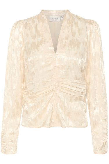 OBS! Fjernlager. Levering kan blive forlænget med 2-3 dage, hvis varen ikke findes i vores butik lige nu.Smuk bluse fra Gestuz med et feminint snit, lange ærmer, v-udskæring i halsen og en flot kvalitet med et fint tone-i-tone mønster.