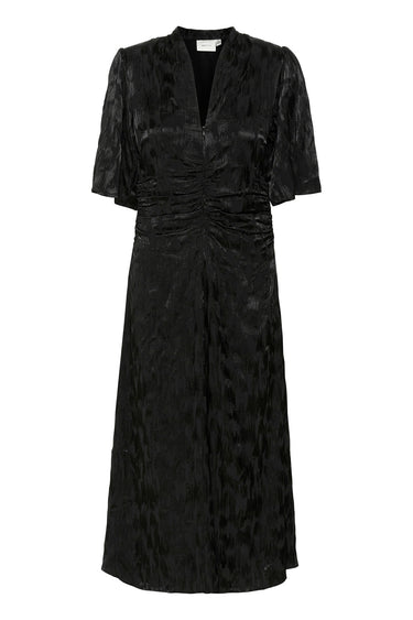 - OBS! Fjernlager. Levering kan blive forlænget med 2-3 dage, hvis varen ikke findes i vores butik lige nu.Smuk kjole fra Gestuz med et feminint snit, ½ lange ærmer, v-udskæring i halsen og en flot kvalitet med et fint tone-i-tone mønster.