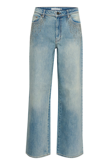 OBS! Fjernlager. Levering kan blive forlænget med 2-3 dage, hvis varen ikke findes i vores butik lige nu.Super smarte jeans fra Gestuz med vidde i benene, et straight-leg snit og de skønneste similisten omkring forlommerne.