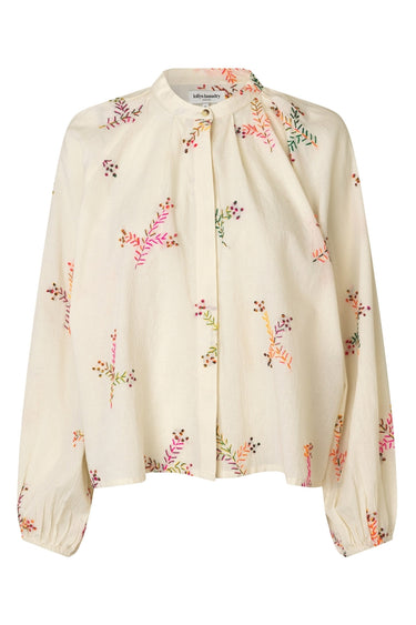 Feminin skjortebluse fra Lollys Laundry med lange ærmer, kinakrave i halsen og skjult knaplukning langs fronten.Blusen har også en afslappet silhuet og farverige broderet detaljer.