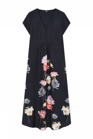 - OBS! Fjernlager. Levering kan blive forlænget med 2-3 dage, hvis varen ikke findes i vores butik lige nu.Smuk kjole fra Gustav med små ærmer, v-udskæring i halsen med et kort knappanel og det flotteste blomsterprint i bunden af skørtet.