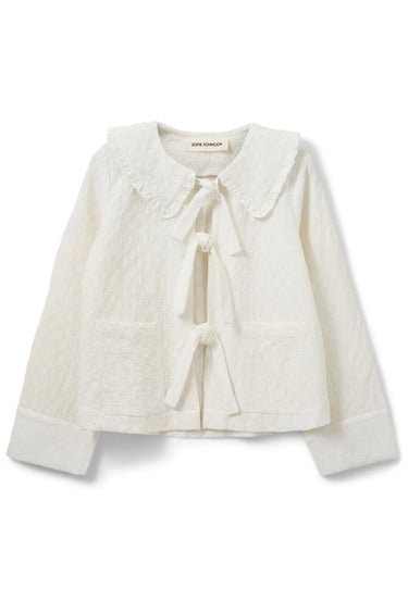 - OBS! Fjernlager. Levering kan blive forlænget med 2-3 dage, hvis varen ikke findes i vores butik lige nu.Feminin skjorte fra Sofie Schnoor med lange ærmer, rund hals med en fin afrundet krave og store bindebånd langs fronten.