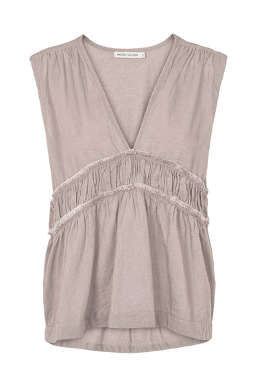 OBS! Fjernlager. Levering kan blive forlænget med 2-3 dage, hvis varen ikke findes i vores butik lige nu.Sød og feminin bomuldstop fra Rabens Saloner med v-udskæring i halsen, en afslappet silhuet og fine detaljer.