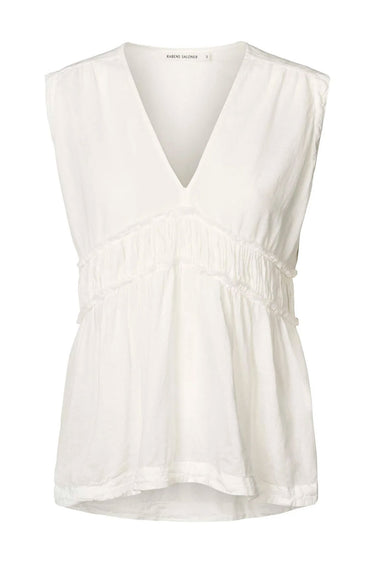 OBS! Fjernlager. Levering kan blive forlænget med 2-3 dage, hvis varen ikke findes i vores butik lige nu.Sød og feminin bomuldstop fra Rabens Saloner med v-udskæring i halsen, en afslappet silhuet og fine detaljer.