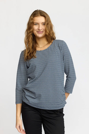 OBS! Fjernlager. Levering kan blive forlænget med 2-3 dage, hvis varen ikke findes i vores butik lige nu.Fin enkel bluse fra 2-Biz med ¾ lange ærmer, rund hals og et smart mønster.