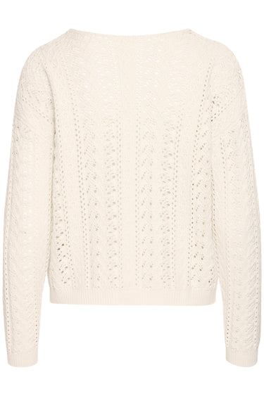 OBS! Fjernlager. Levering kan blive forlænget med 2-3 dage, hvis varen ikke findes i vores butik lige nu.Feminin strik fra Ichi med lange ærmer, et smukt mønster og en dyb v-udskæring i ryggen.