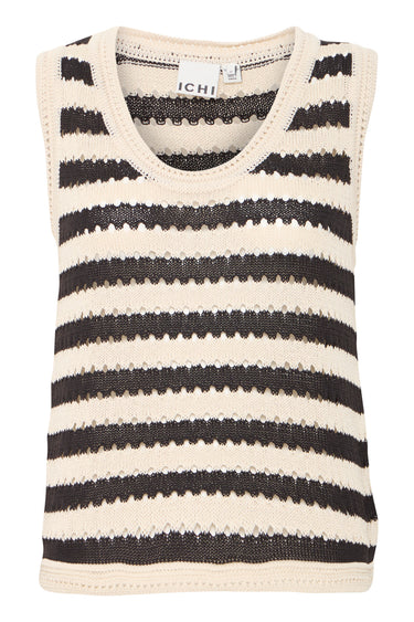 - OBS! Fjernlager. Levering kan blive forlænget med 2-3 dage, hvis varen ikke findes i vores butik lige nu.Super blød strikket top fra Ichi med rund hals og klassiske brede striber.