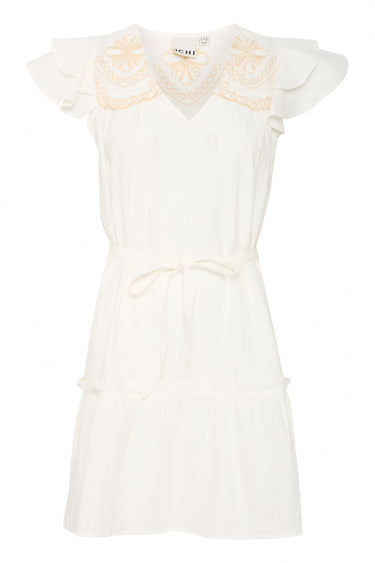 - OBS! Fjernlager. Levering kan blive forlænget med 2-3 dage, hvis varen ikke findes i vores butik lige nu.Sød kjole fra Ichi med v-udskæring i halsen, korte flæseærmer og de smukkeste broderet detaljer over brystet. Kjolen har også et smalt bindebælte i taljen og en fin silhuet.