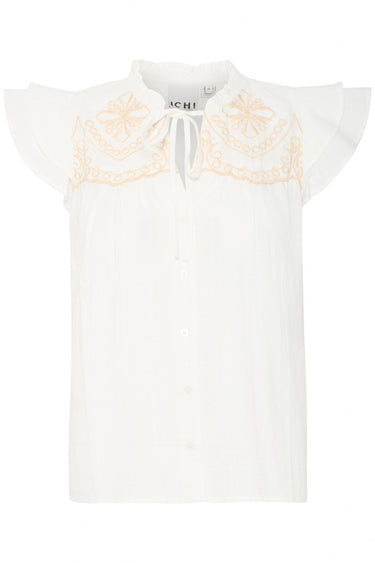 - OBS! Fjernlager. Levering kan blive forlænget med 2-3 dage, hvis varen ikke findes i vores butik lige nu.Sød top fra Ichi med v-udskæring og en lille bindesnor i halsen, små flæseærmer og de smukkeste broderet detaljer over brystet.