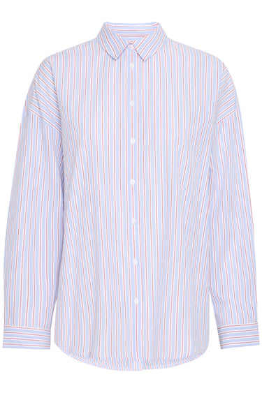 OBS! Fjernlager. Levering kan blive forlænget med 2-3 dage, hvis varen ikke findes i vores butik lige nu.Cool let oversized skjortebluse fra Ichi med lange ærmer, en lille krave i halsen og et klassisk pinstripe print.