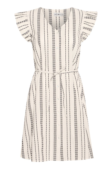 - OBS! Fjernlager. Levering kan blive forlænget med 2-3 dage, hvis varen ikke findes i vores butik lige nu.Smart kjole fra Ichi med små ærmer, v-udskæring i halsen og et fint print.Kjolen har også en afslappet silhuet og et smalt bindebælte i taljen.