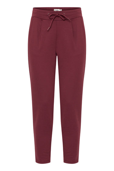 OBS! Fjernlager. Levering kan blive forlænget med 2-3 dage, hvis varen ikke findes i vores butik lige nu.Flotte enkle bukser fra Ichi med en bred elastikkant og bindesnor i taljen, en slim-leg silhuet og en cropped længde.