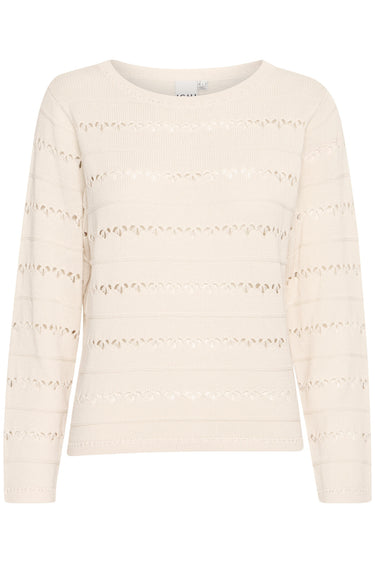 - OBS! Fjernlager. Levering kan blive forlænget med 2-3 dage, hvis varen ikke findes i vores butik lige nu.Feminin strik fra Ichi med lange ærmer, et smukt mønster og bådudskæring i halsen.