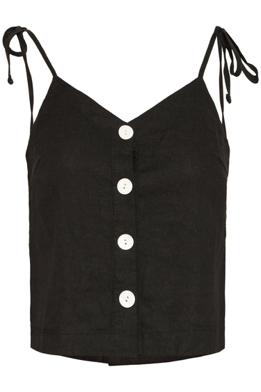 - OBS! Fjernlager. Levering kan blive forlænget med 2-3 dage, hvis varen ikke findes i vores butik lige nu.Feminin top fra Ichi med smalle bindestropper over skulderne, en let cropped længde og fine knapper langs fronten.