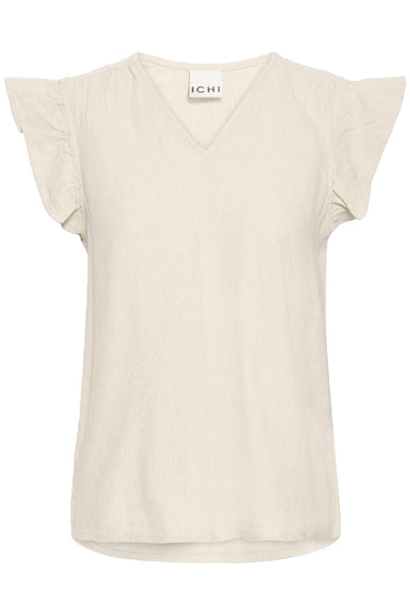 - OBS! Fjernlager. Levering kan blive forlænget med 2-3 dage, hvis varen ikke findes i vores butik lige nu.Feminin bluse fra Ichi med v-udskæring i halsen og fine flæseærmer.