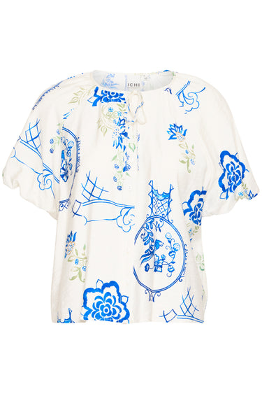 - OBS! Fjernlager. Levering kan blive forlænget med 2-3 dage, hvis varen ikke findes i vores butik lige nu.Flot grafisk tee fra Ichi med korte ærmer og rund hals.