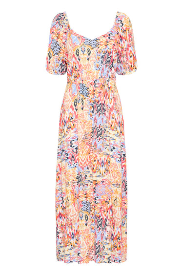- OBS! Fjernlager. Levering kan blive forlænget med 2-3 dage, hvis varen ikke findes i vores butik lige nu.Smuk kjole fra Ichi med korte pufærmer, en feminin halsudskæring og et skønt print.