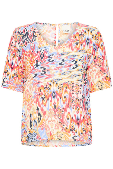 OBS! Fjernlager. Levering kan blive forlænget med 2-3 dage, hvis varen ikke findes i vores butik lige nu.Smart bluse fra Ichi med korte ærmer, v-udskæring i halsen og et fint print.