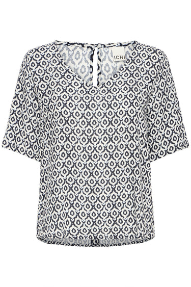 OBS! Fjernlager. Levering kan blive forlænget med 2-3 dage, hvis varen ikke findes i vores butik lige nu.Smart bluse fra Ichi med korte ærmer, v-udskæring i halsen og et fint print.