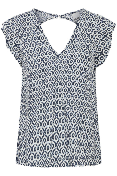- OBS! Fjernlager. Levering kan blive forlænget med 2-3 dage, hvis varen ikke findes i vores butik lige nu.Flot bluse fra Ichi med v-udskæring i halsen og ryggen, små ærmer og et smukt print.
