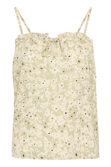 - OBS! Fjernlager. Levering kan blive forlænget med 2-3 dage, hvis varen ikke findes i vores butik lige nu.Smart top fra Ichi med smalle skulderstropper, en lille flæsekant i toppen og en fin bindebånds detalje foran.