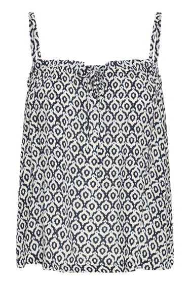 - OBS! Fjernlager. Levering kan blive forlænget med 2-3 dage, hvis varen ikke findes i vores butik lige nu.Smart top fra Ichi med smalle skulderstropper, en lille flæsekant i toppen og en fin bindebånds detalje foran.