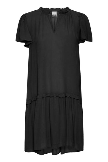 OBS! Fjernlager. Levering kan blive forlænget med 2-3 dage, hvis varen ikke findes i vores butik lige nu.Fin enkel kjole fra Ichi med ½ lange ærmer, rund hals med v-udskæring og en bred flæsekant i bunden.