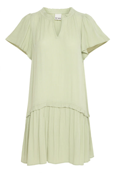 OBS! Fjernlager. Levering kan blive forlænget med 2-3 dage, hvis varen ikke findes i vores butik lige nu.Fin enkel kjole fra Ichi med ½ lange ærmer, rund hals med v-udskæring og en bred flæsekant i bunden.