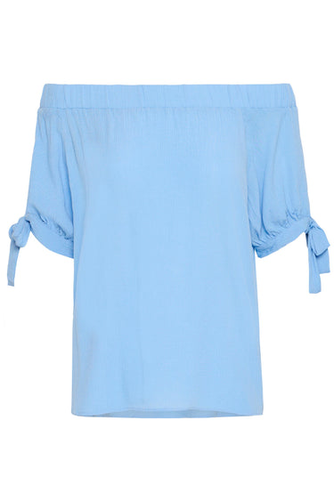 - OBS! Fjernlager. Levering kan blive forlænget med 2-3 dage, hvis varen ikke findes i vores butik lige nu.Flot bluse fra Ichi med korte ærmer, et super fint off-shoulder snit og skønne bindebånd i bunden af ærmerne.