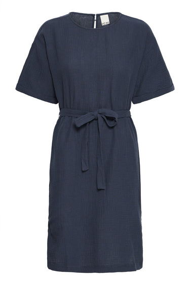 OBS! Fjernlager. Levering kan blive forlænget med 2-3 dage, hvis varen ikke findes i vores butik lige nu.Fin enkel kjole fra Ichi med korte ærmer, bådudskæring i halsen og et bredt bindebælte i taljen.