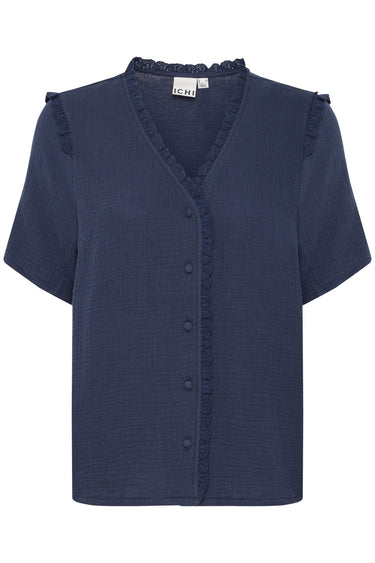 - OBS! Fjernlager. Levering kan blive forlænget med 2-3 dage, hvis varen ikke findes i vores butik lige nu.Sød enkel bluse fra Ichi med korte ærmer og v-udskæring i halsen.