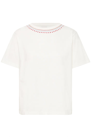 - OBS! Fjernlager. Levering kan blive forlænget med 2-3 dage, hvis varen ikke findes i vores butik lige nu.Smart tee fra Ichi med korte ærmer, rund hals med super fine broderet detaljer og en løs silhuet.