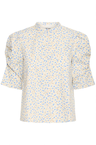 OBS! Fjernlager. Levering kan blive forlænget med 2-3 dage, hvis varen ikke findes i vores butik lige nu.Sød bluse fra Ichi med ½ lange ærmer, kinakrave i halsen og et skønt blomstret mini print.