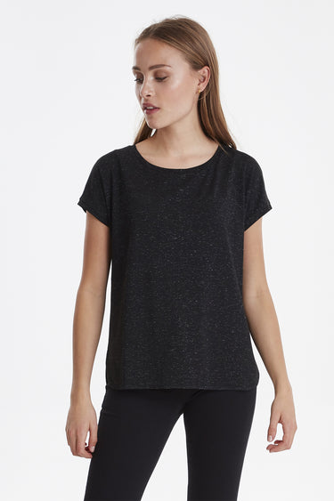 OBS! Fjernlager. Levering kan blive forlænget med 2-3 dage, hvis varen ikke findes i vores butik lige nu.Fin glimmer tee fra Ichi med korte ærmer og bådudskæring i halsen.
